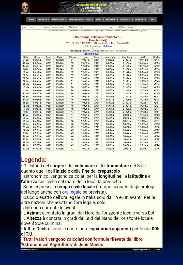 Sotto foto delle effemeridi del Sole dove potete cambiare il luogo, il mese e l'anno.